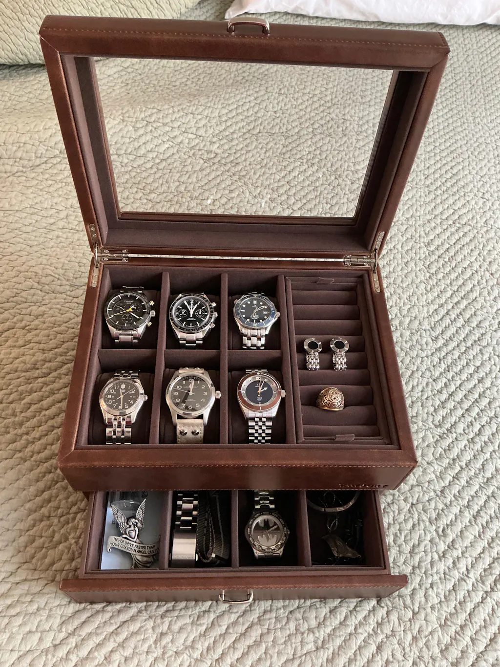 I’m starting to build out my watch collection and I really like the storage drawer this box has for my addition bracelets and tools. I chose this one because I really like having the additional section on top for cuff links and rings. My only complaint is that I now need a larger box due to acquiring new watches, but the larger options don’t have the section for cuff links/rings. I wish this piece was interchangeable with the larger boxes.