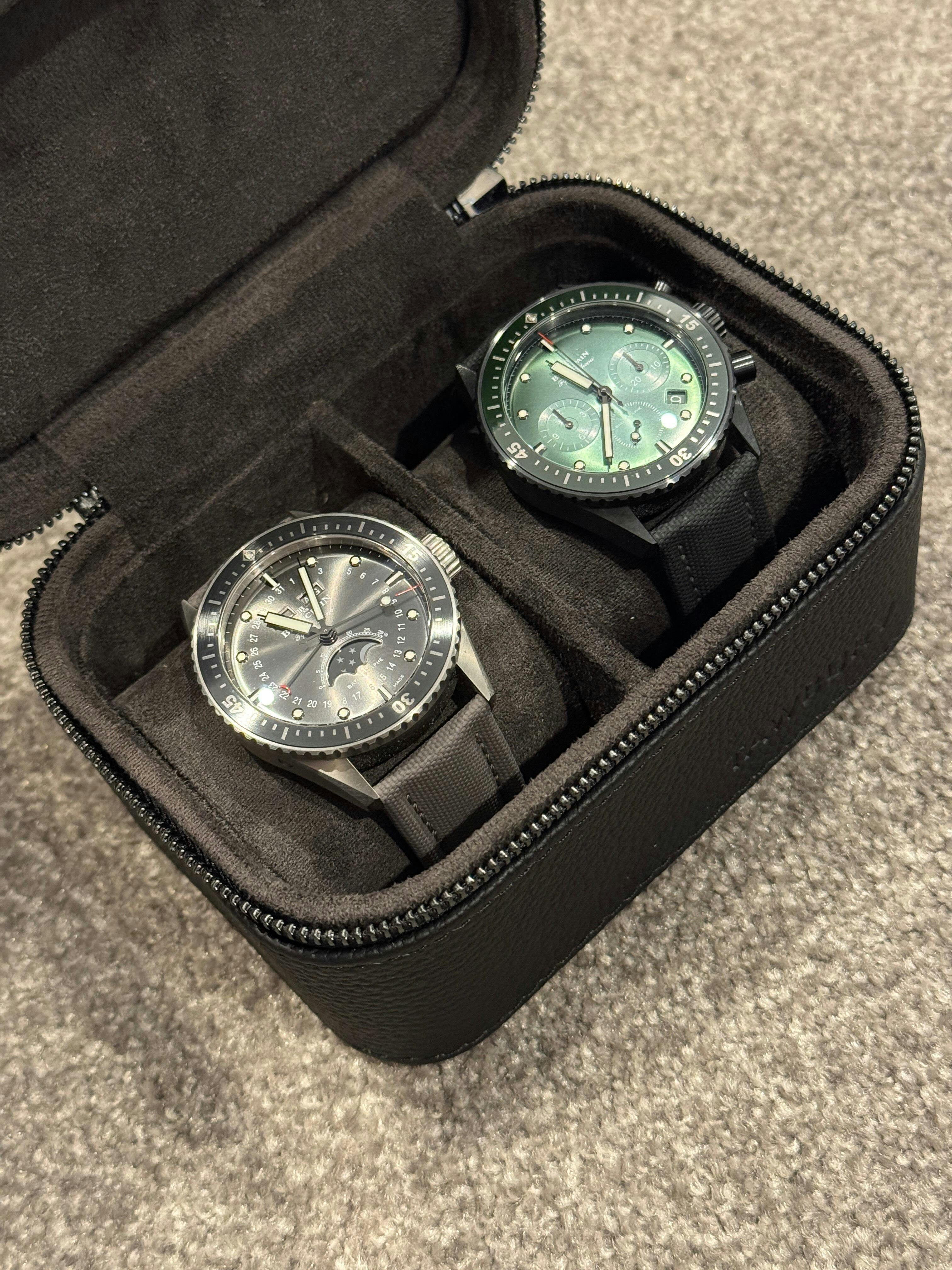 The Fraser 2 Watch Travel Case in Black is very appealing to the eye, but even more so is its functionality. It is small (smaller by area than many other 2 watch travel cases), yet it protects the watches inside with a strong "floor" (bottom) and "ceiling" (top). The pull out pad nestled inside the top of the case further protects the watches, and the accordion-like pillows are very accommodating. Finally, (and to me this is just as important), Tawbury is a company that I want to support. They take customer service seriously, and appreciate your purchase by making sure you can contact them with any issues (of which I have had none). If you are between a Tawbury product and another, you cannot go wrong if you choose Tawbury.