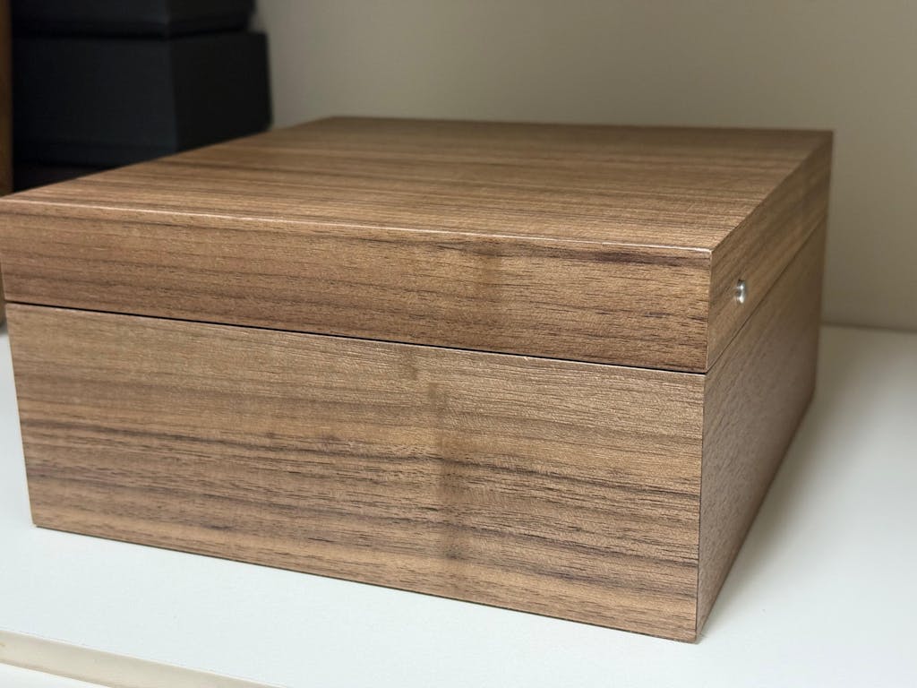 - An exquisite Walnut wood veneer boasts a textured grain finish. With every touch creating a tangible connection between you and your watch box.